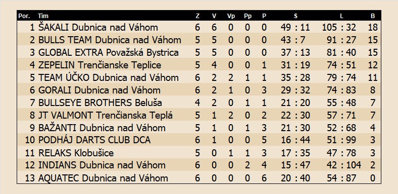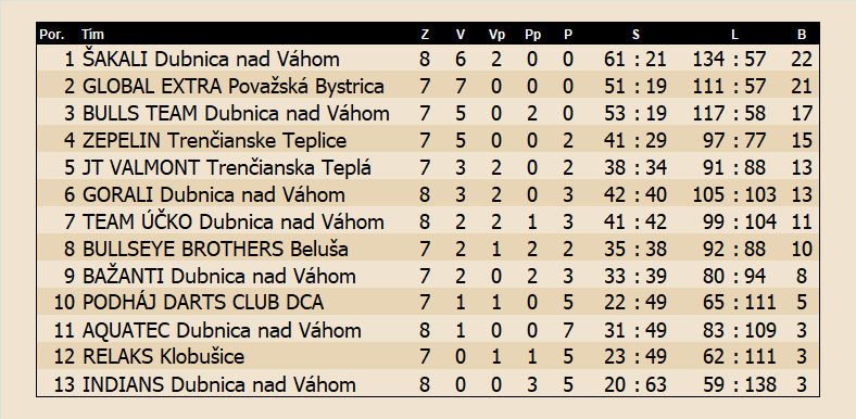 Indians - Bulls Team 0:10, Aquatec - Šakali 3:7, Podháj Darts Club - Relaks 6:4 |