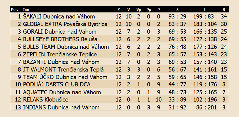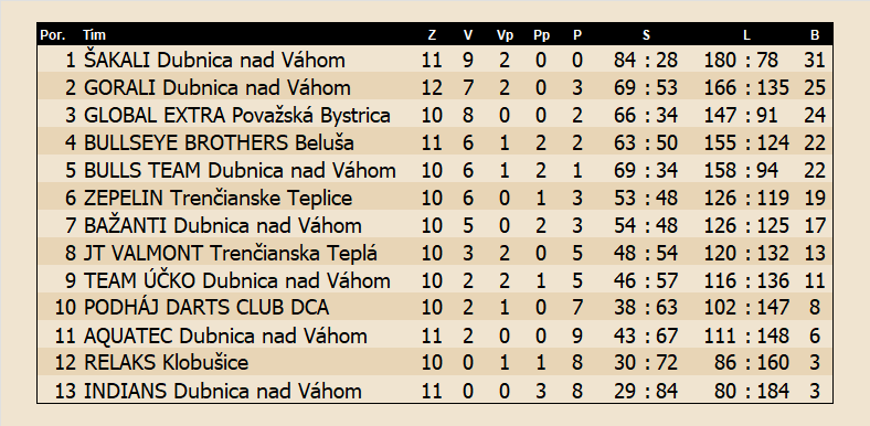 Zepelin - Šakali 1:9, Global Extra - Team Účko 7:3, Podháj Darts Club - Gorali 4:6, Indians - Aquatec 3:7 |