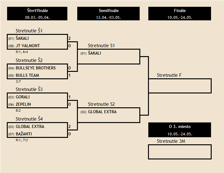 Bažanti - Global Extra 3:7, Bullseye Brothers - Bulls Team 3:7, JT Valmont - Šakali 4:6 |